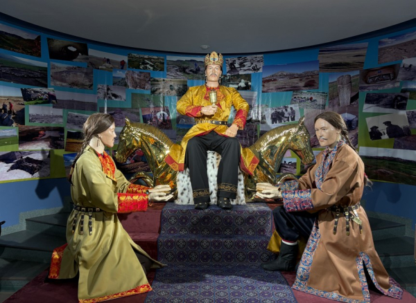 Белгілі археолог Зейнолла Самашев пен суретші, этнограф Қалиолла Ахметжан жасаған бұл мүсіндер шынайы кейіптен аумайды. Көз жанарларына дейін «тірілткен». 2022 жылы Елеке сазынан табылған белдіктегі жапсырма негізінде жасалып жатқан композицияда түркі қағаны төрде кеңес өткізіп отыр. Астындағы тағы қос арғымақта отырғандай жасалған. Ал қызметшілері бір саты төменнен әлдеқандай хат ұсынып тұр. Буып, мөр соғылған хат алтын түстес табаққа салынған. Музей қызметкерінің айтуынша, табақ Моңғолиядағы Орхон-Енисей өзені маңында жерленген Білге қағанның мемориалдық кешенінен табылған негізінде жасалыпты.