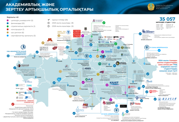 Қазақстанда 40 жетекші шетелдік университетпен стратегиялық серіктестік орнатылған, оның ішінде 33 филиалы қазіргі уақытта жұмыс істеп тұр. Бұл қадамдар бәсекеге қабілетті кадрларды даярлау, ғылымды дамыту және елдің әлемдік академиялық қауымдастыққа интеграциялануы үшін мықты негіз қалыптастырады.