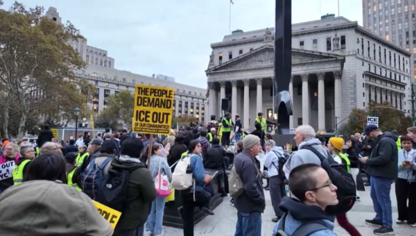 Нью-Йоркте федералды үкіметтің мигранттарды қатаң тексеруіне қарсы шеру өтіп, жүздеген адам Манхэттеннің басты алаңын басып алды.
