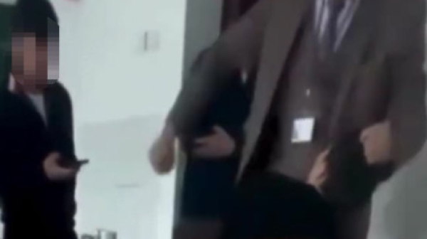 Әлеуметтік желіде жарияланған видеода костюм киген ер адам орындықта отырған оқушыны шашынан тартып, кейін иығынан жұдырықпен ұрады, сосын баланы өзіне қаратып құлағынан тартады. Оқиға басқа оқушылардың көз алдында болған, алайда балалар ешқандай реакция білдірмейді.