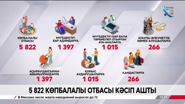 Елімізде жыл басынан бері 6 мыңға жуық көпбалалы отбасы қайтарымсыз грант иегері атанды. Сондай-ақ 1400-ге тарта мүгедектігі бар тұлғалар , мыңнан аса мүгедек бала тәрбилеп отырған ата-аналар өз бизнесін бастады.