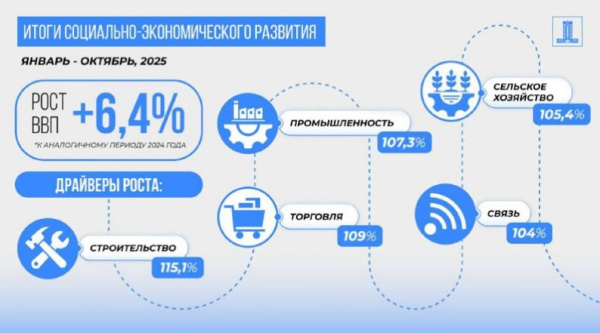 По предварительным данным Бюро национальной статистики, за январь-октябрь 2025 года валовой внутренний продукт Казахстана увеличился на 6,4% по сравнению с аналогичным периодом прошлого года.