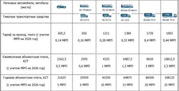 Тариф жолда бір сағатқа тең мөлшердегі уақытқа және көлік құралының санатына байланысты есептеледі.